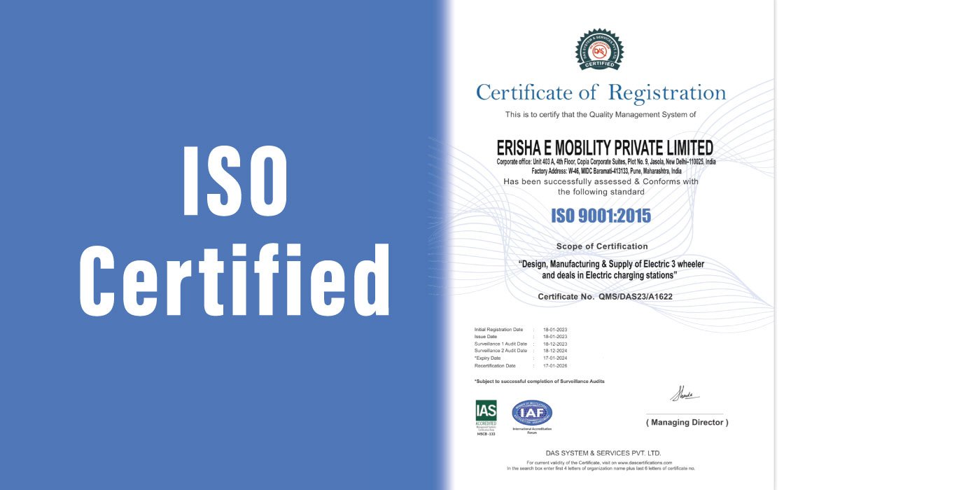 Erisha EV is now ISO9001:2015, ISO14001:2015 & ISO45001:2018 certified Company